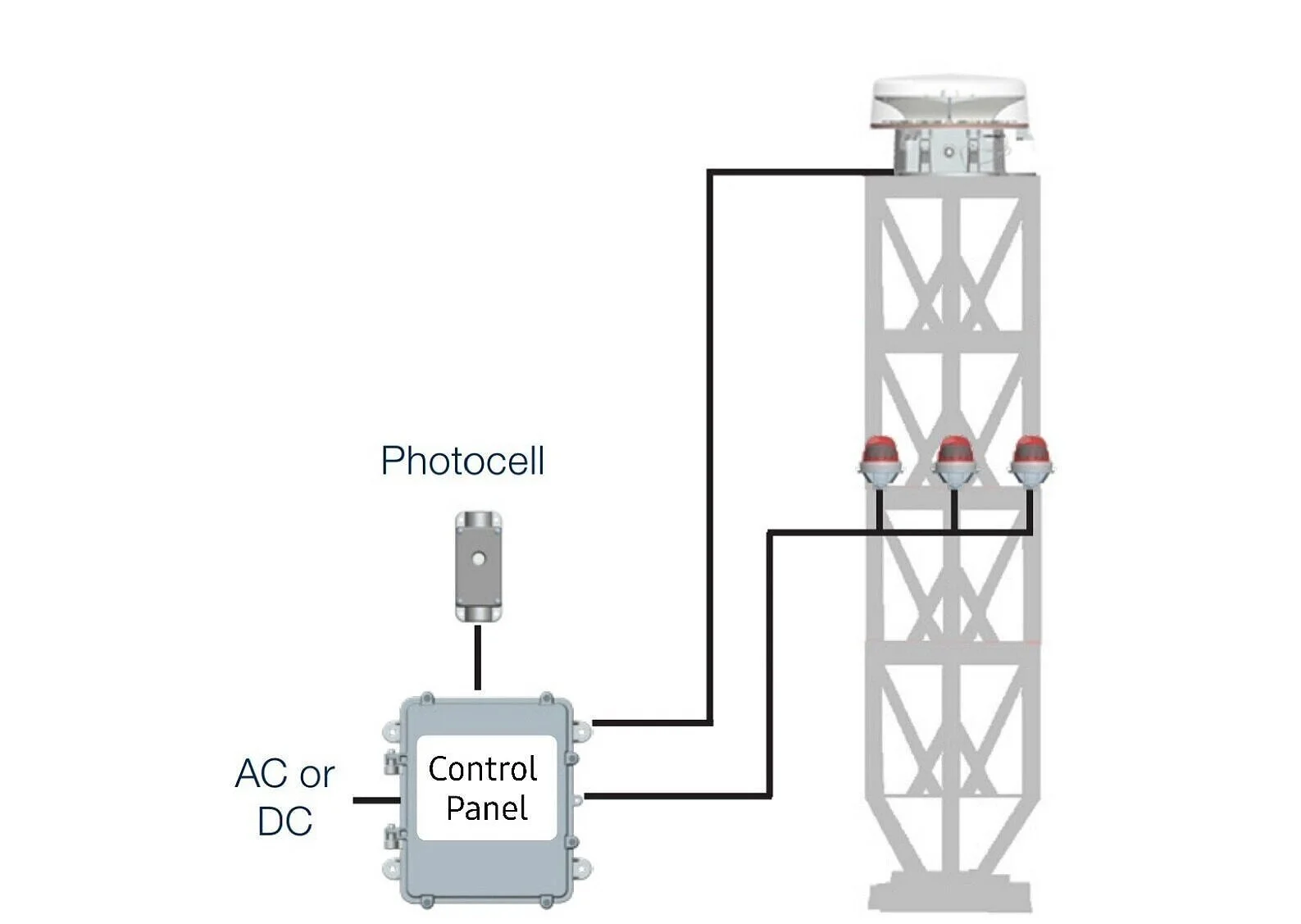 Aviation authorities specified Red and White lights are to be used to warn aircraft of tall structures. The Low Intensity Obstruction Light is the most common type. Flashing Medium Intensity Beacon (Day & Night options available) are typically for taller structures.